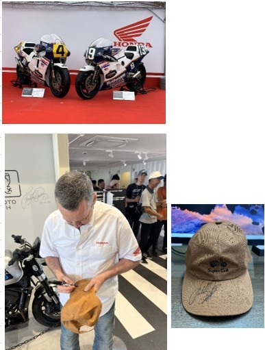 会場に入ると、バイク部品メーカーのブース、GP500 & GP250ダブルチャンピオンを獲得したNSR500とRS250RWの展示のほか、メインステージでスペンサーとのトークショー、元ホンダワークスライダー宮城光をはじめ日本人のゲストの対談を楽しみました。