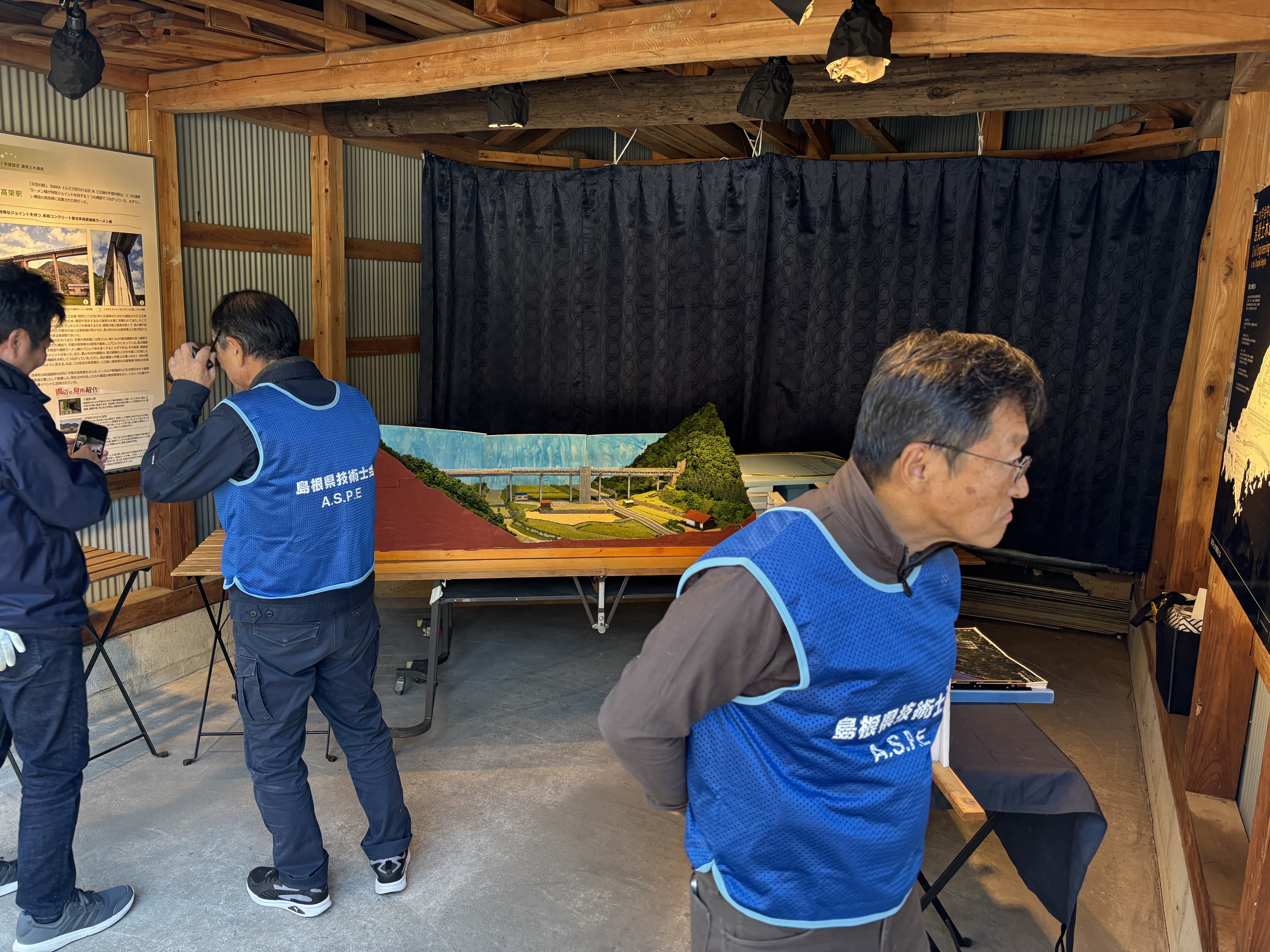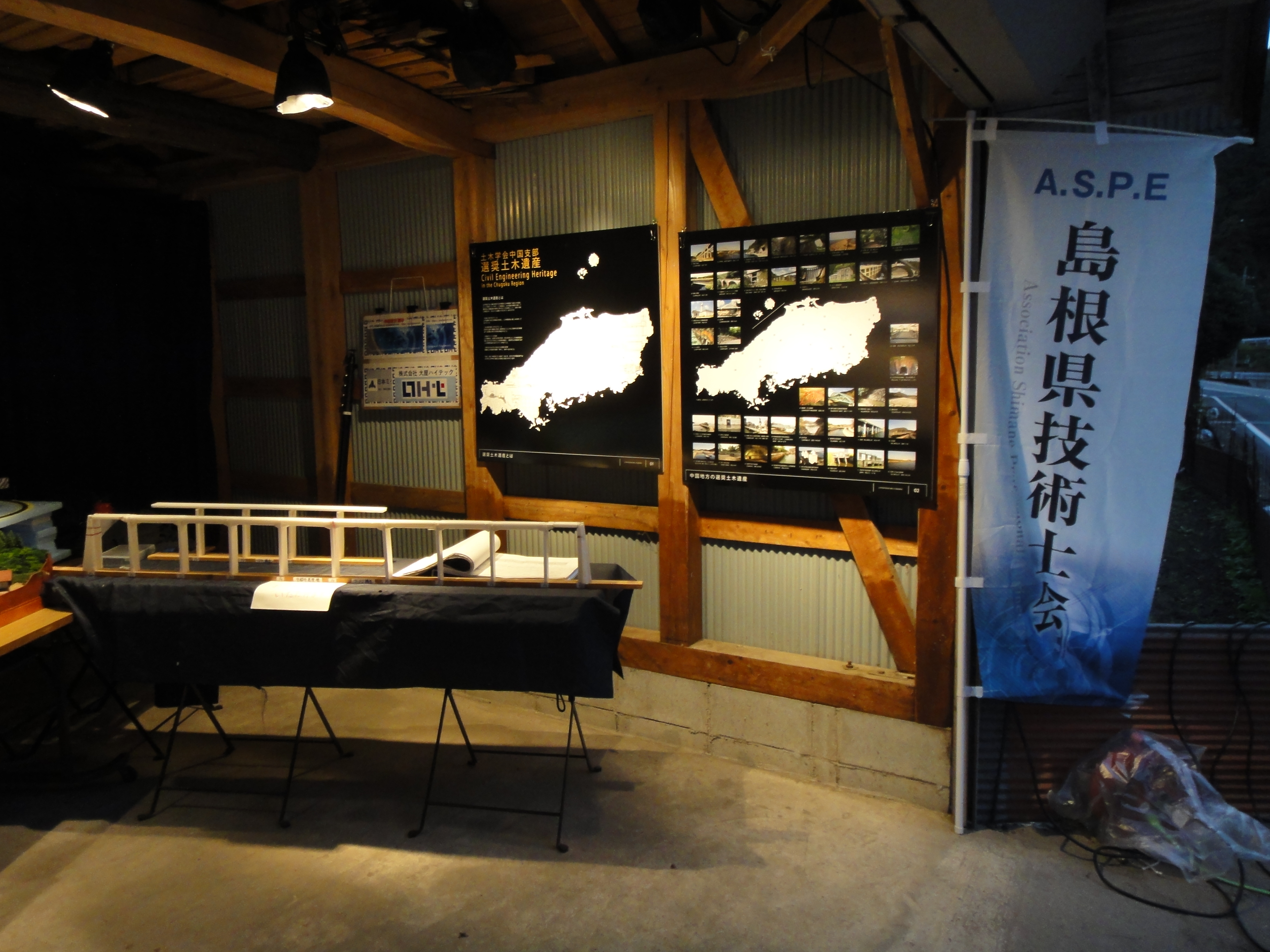 宇都井高架橋は邑南町鉄道公園施設なので認定証は町長が受け取りに来たのですが、今まで町長と面会したことはありません。選挙の時に会社の先頭に立って握手をしたぐらいですが、大屋ハイテックは御存じの様子です。ここでも、島根大学鉄道研究会とともに展示ブースを設けて土木遺産パネルや構造モデルを紹介していたのですが、次々と見物者が訪れて休む暇もなく、声がかれるほど説明を繰り返しました。